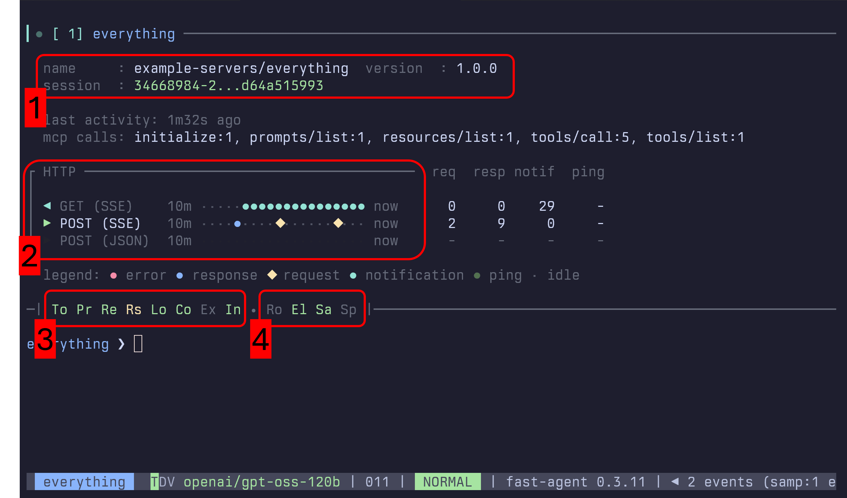 These values flow through to both fast-agent check and the in-session /mcp display. When multiple events occur in the same bucket, higher priority states replace lower ones using this order: errordisabled/requestresponsenotification/pingnone. This keeps significant events (such as errors and requests) visible even if a subsequent ping lands in the same interval.